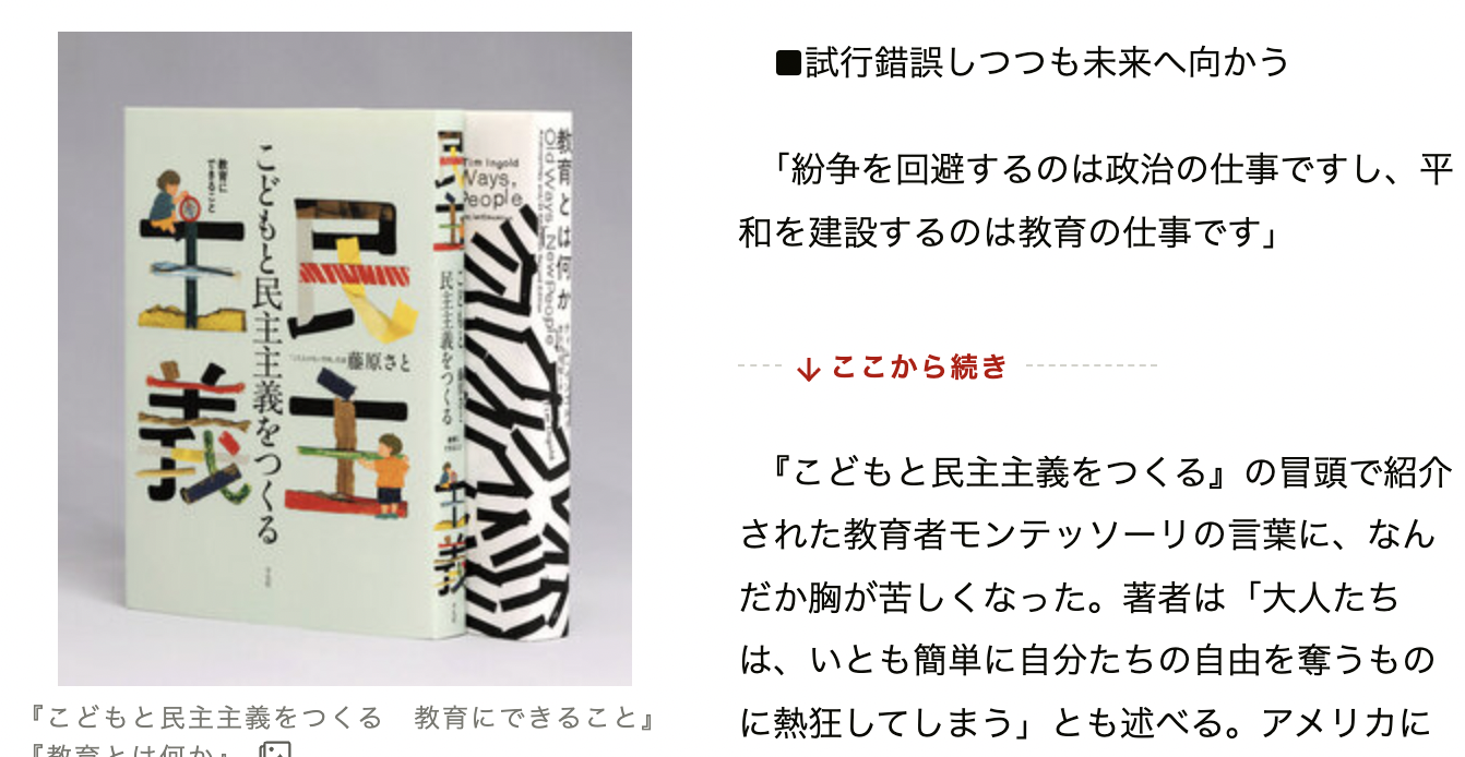 朝日新聞で藤原さと『こどもと民主主義をつくる』の書評が掲載されました By スタッフ2026-03-072026-04-08NEWS、メディア掲載 朝日新聞で藤原さと『こどもと民主主義をつくる』が紹介されました。評者は東京大学教授(科学史)の隠岐さや香さんです。 https://book.asahi.com/article/16402858 <私たちについて> こたえのない学校HP https://kotaenonai.org/ こたえのない学校ブログ https://kotaenonai.org/blog/ ×探究・Learning Creators Lab ※こたえのない学校の主催する教育者向け年間プログラムです。 Facebook ページhttps://www.facebook.com/kotaenonai.org