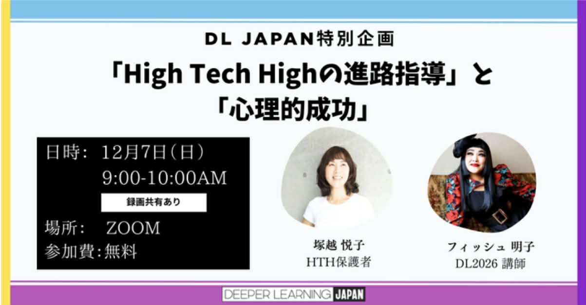 保護者としてHTHの小・中・高を体験してきたDL Japan運営メンバーの塚越さんが、保護者目線から、他人や社会と比較するのではなく、自分にとっての幸せ・喜びを感じ充足感や達成感を得られる状態を指す「心理的成功」に着目して、ハイテックハイの教育を紹介します。